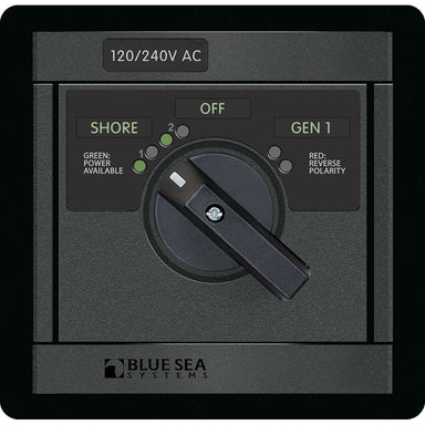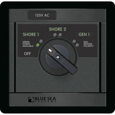 1482 120V AC Rotary 30A OFF + 3 SourcesFeatures: Switches three 120V AC sources Red reverse polarity LED indicators Green power available LED indi...