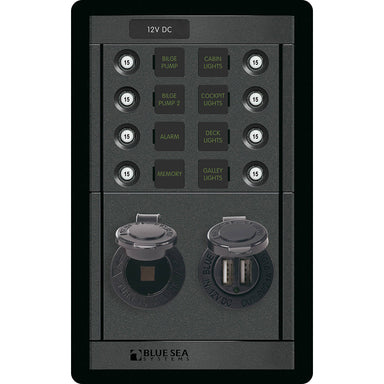 1498 - 360 Panel - 8 Position 12V Panel with Dual USB & 12V SocketPart of the Blue Sea Systems Battery Management Panels. This DC Branch Circ...