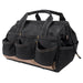 This tool carrier includes a multi-compartment plastic parts tray, 21 tool pockets and sleeves, a zippered main compartment, padded handles, and abrasion resistant rubber feet.