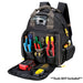 The CLC Tech Gear ™ dual compartment 53 pocket LED lighted tool storage backpack features an integrated 3 level LED light that swivels, 2 straps for cordless drill/driver and battery charger, carrying handles, padded shoulders with sternum strap and back padding.