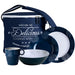 The 16-piece melamine kitchenware pack is practical melamine set for 4 people. It consists of 4 dinner plates, 4 soup plates, 4 dessert plates, 4 stackable mugs, and a container basket